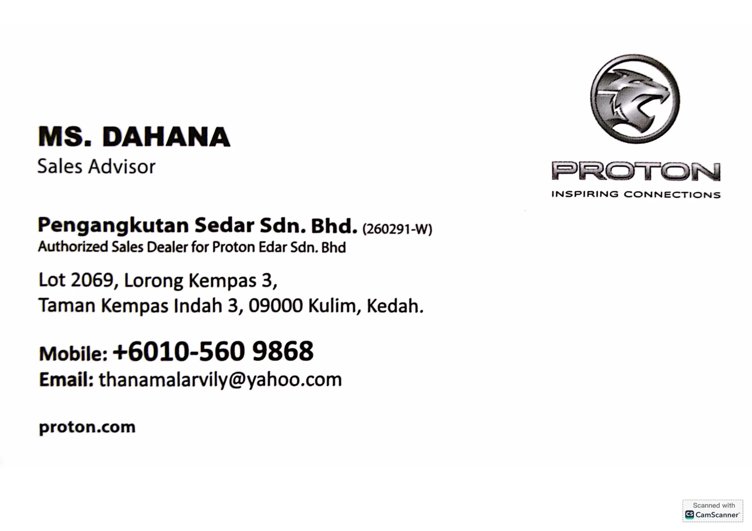 Hai! Nama saya Ms. Dahana, Sales Advisor Proton Kulim, Kedah yang sah. Berpengalaman lebih 15 tahun dalam bidang jualan kereta dan 6 tahun bersama Proton di Malaysia.